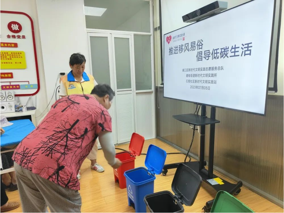 活动中,志愿者通过PPT向居民解释低碳环保的概念,从用水、用电、消费等方面,号召居民理性消费、不争面子、不摆阔气,合理消费、引领社区“节约用水”“节约用电”等文明节俭潮流,牢固树立节约光荣、浪费可耻的思想观念。随后邀请现场居民上台志愿者给辖区居民讲解垃圾分类的意义和垃圾分类的小知识。紧接着,在以厨余垃圾、有害垃圾、其他垃圾和可回收物为图标的“四分类”卡片模拟投放环节将活动推向高潮,居民每人随机抽取垃圾分类小卡片,正确地进行分类,然后投放在相应颜色的垃圾桶内。活动在紧张欢乐的氛围中提升了居民群众垃圾分类知识知晓率和投放准确率。同时号召大家积极参加到节俭养德的全民行动中来,树立绿色环保、低碳生活。