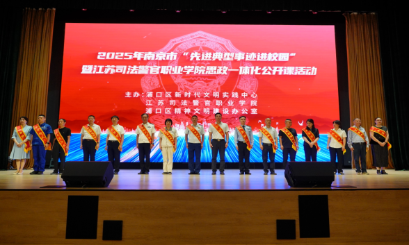为深入推进公民道德建设,充分发挥先进典型示范引领作用,积极营造向上向善的社会风尚,9月12日下午,2025年南京市“先进典型事迹进校园”暨江苏司法警官职业学院思政一体化公开课活动在江苏司法警官职业学院报告厅举行,南京市文明办、江苏司法警官职业学院、浦口区文明办、浦口区教育局等单位相关负责同志,南京市各级身边好人、道德模范、“美善浦口人”代表,江苏司法警官职业学院师生代表700余人参加了活动。
