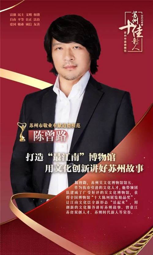 陈曾路,苏州吴文化博物馆馆长。他全力建设“高水平、有特色”的中小型博物馆,主持完成的吴文化博物馆基本陈列展览获第十八届全国博物馆“十大陈列展览精品奖”,精彩纷呈的数十场特展赢得业内及观众的认可。他曾获江苏省双创人才、苏州市姑苏宣传文化特聘人才、苏州市实事项目工作贡献突出个人等荣誉。