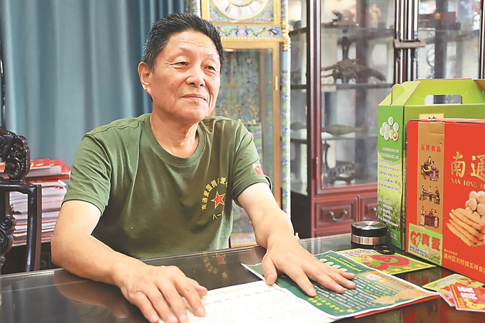 板寸头、身着标有“爱国拥军”“八一纪念”字样的绿T恤,张志光身上满满的军人味道。