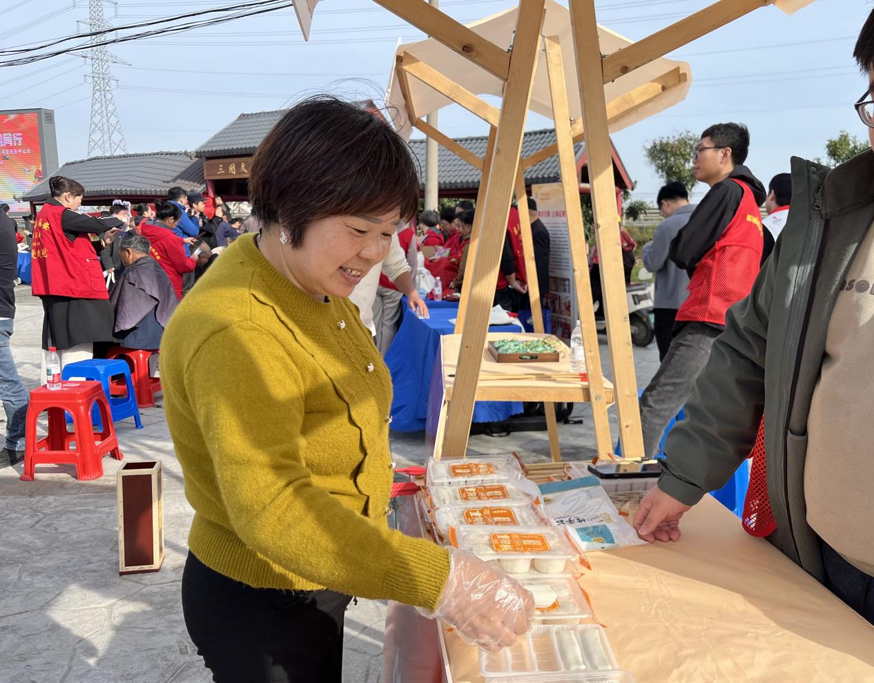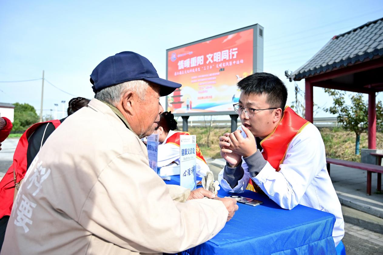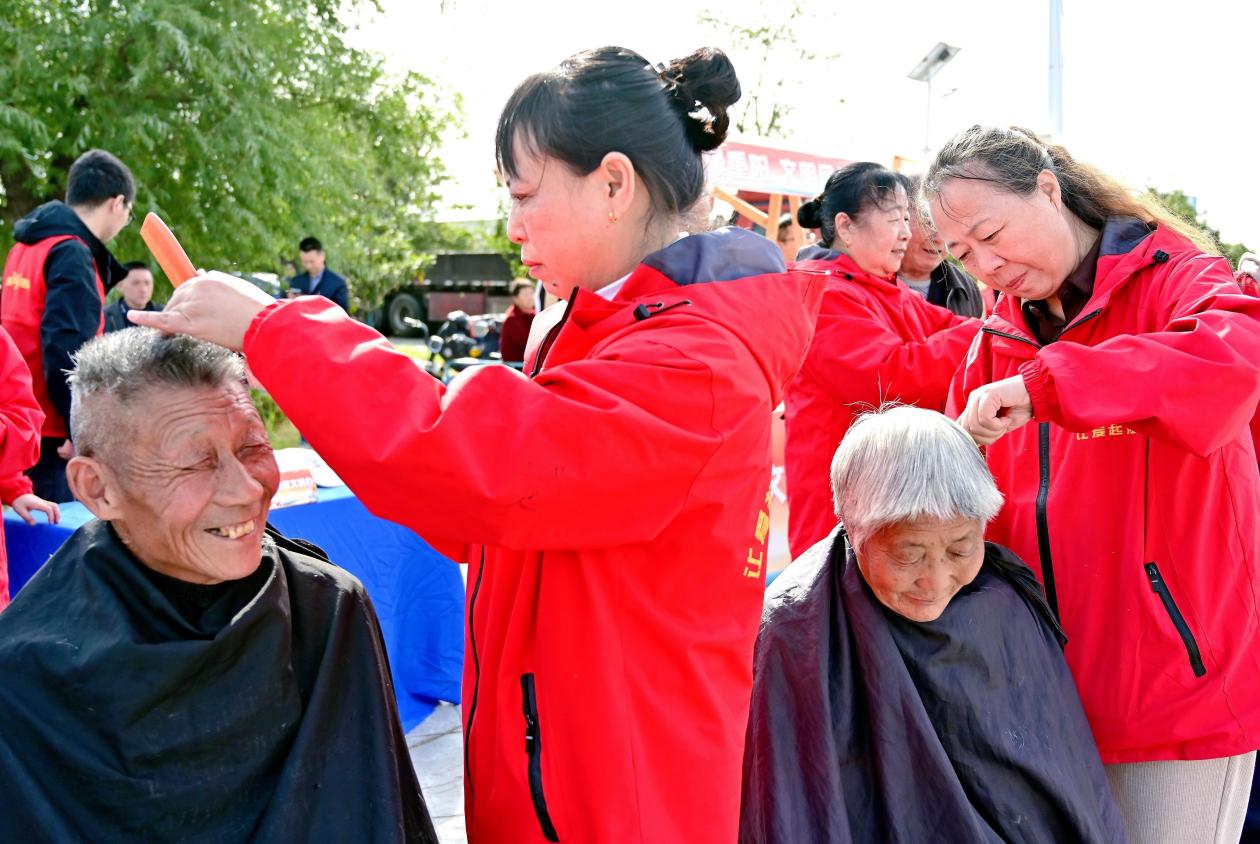 广场四周,形式多样的志愿服务摊位构成了一个充满温情的“便民集市”。在免费理发摊位前,让爱启航公益团队的志愿者们手中的剪刀上下翻飞,一位位老人片刻间便焕发出清爽的精神面貌;中国移动的志愿者则在耐心辅导老人如何与远方的儿女视频通话;传统文化摊位也吸引了大量群众参与,体验重阳节佩戴香囊、品尝重阳糕等习俗。此外,市中级人民法院、淮安海关、区司法局、区医保局等单位也分别设立了服务点,为村民提供普法宣传、卫生知识讲解、法律咨询和医保政策解读等服务。 一个个“红马甲”穿梭在人群中,成为秋日里最温暖的风景。