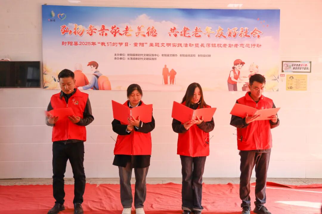 活动现场,一场融合文化内涵与仪式感的特别环节同步举行。4名村级宣传文化管理员身着红色志愿服,深情朗诵原创诗作《重阳颂・敬老情》。“当青丝染霜雪,当步履渐蹒跚,我们用陪伴作铠甲,用敬爱护周全……”字里行间传递着对长者最诚挚的敬意。台下老人们凝神聆听,不时颔首,在诗意流淌中感受孝道新韵。