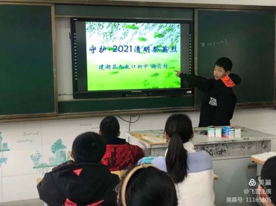 近日,九龙口初中开展“守护·2021清明祭英烈”宣传教育活动,精心编制教育课件,认真组织各班级学习。同学们借此节日缅怀先烈,立志为中华民族的伟大复兴而努力奋斗!