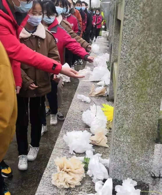 3月31日,颜单小学师生代表参加“缅怀革命先烈,传承英雄遗志”清明节扫墓活动。同学们向烈士们敬献自己亲手制作的小白花,表达自己对烈士们的沉痛悼念。