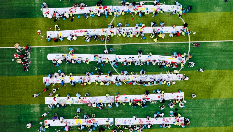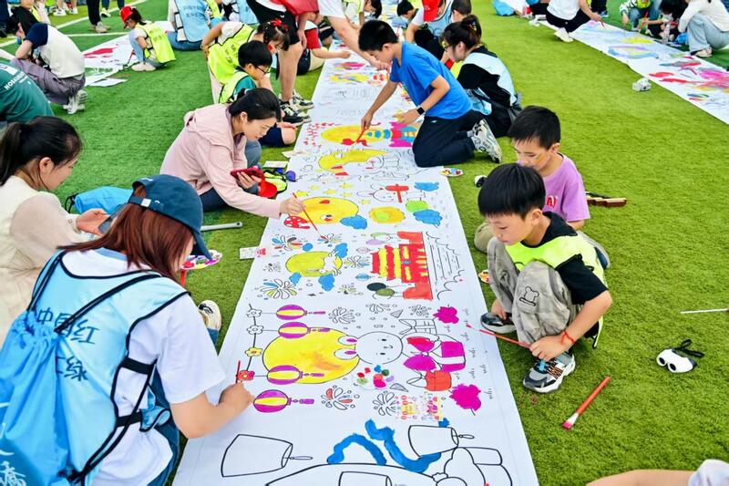 最具感染力的环节,无疑是共绘百米国庆长卷。一幅百米长卷在绿茵场上徐徐铺展,每个家庭在一米见方的画布上,以环保颜料与画笔,围绕红色文化元素尽情创作。在《我的祖国》《歌唱祖国》等动人旋律中,家长与孩子们俯身协作,以稚嫩笔触勾勒斑斓色彩,以温暖共绘传递家国情怀。这不仅是一次艺术的共创,也是一次亲子间的深情对话,更是一堂生动的爱国教育课。