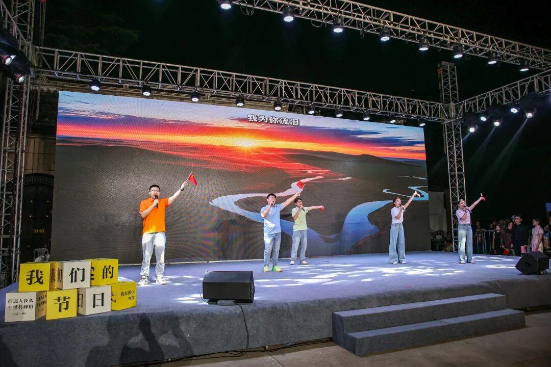 歌舞《我爱你中国》将气氛推向高潮,观众挥舞国旗,齐声合唱,月光与灯光交织成一片红色的海洋。