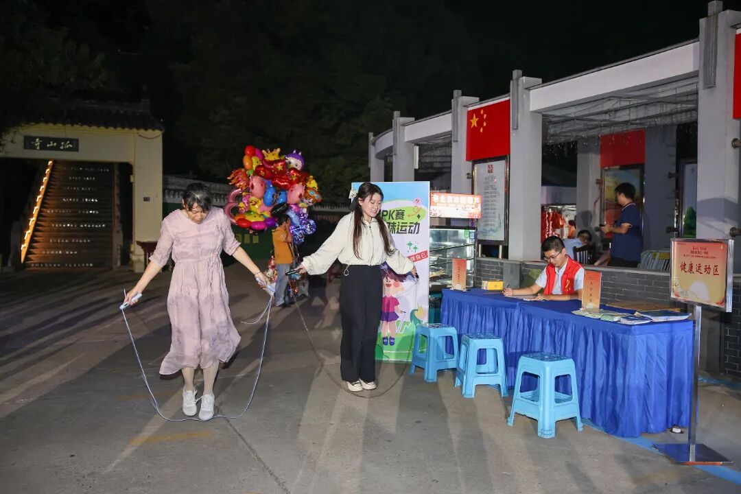 健康运动区,医护人员为老人测量血压并发放秋季养生食谱,跳绳PK赛的欢笑声此起彼伏。