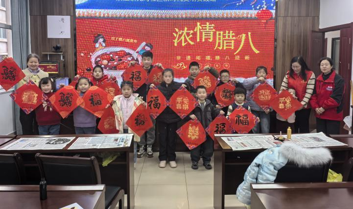 活动中,志愿者结合趣味故事为孩子们讲解腊八节的起源与习俗,孩子们听得津津有味。随后,大家围坐一堂,品尝香甜软糯的腊八粥,浓浓的暖意蔓延开来。最热闹的当数手工拓福环节,在志愿者的指导下,孩子们认真蘸墨、拓印,一张张红彤彤的福字跃然纸上,满是童趣。