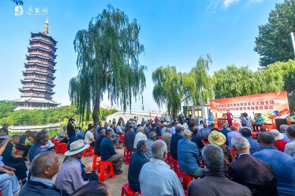 宿城区印象黄河景区双塔公园内热闹非凡,“曲韵流芳 鼓动新声”国家级非遗代表性项目苏北大鼓专场暨2025双节书场惠民演出在此温情启幕,为市民送上一场兼具传统韵味与节日氛围的文化盛宴。苏北大鼓、苏北琴书非遗代表性传承人轮番带来《牵红线》《植槐明志》《罗成托梦》《神奇的牛角淹》等经典作品。现场还设置了非遗代表性项目展示区,刚出炉的埠子车轮饼香气四溢,糖画师傅制作的生肖糖画栩栩如生,还有手艺人展示非遗草编与缅茄篆刻作品。双节书场惠民演出将持续到10月10日,让广大市民过足“曲艺瘾”。