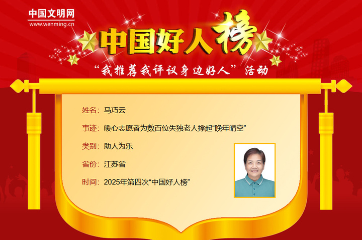 马巧云,女,1959年8月生,江苏大学附属医院退休药剂师。马巧云退休后成为了一名专职志愿者,为失独老人提供挂号缴费、陪诊检查、送饭送菜、心理抚慰等全方位帮扶,甚至自掏腰包精打细算为老人节省开支。她以行动感染八十余人加入志愿团队,为七百多位失独老人提供关爱。马巧云曾荣获“江苏省优秀志愿者”“江苏好人”等荣誉。