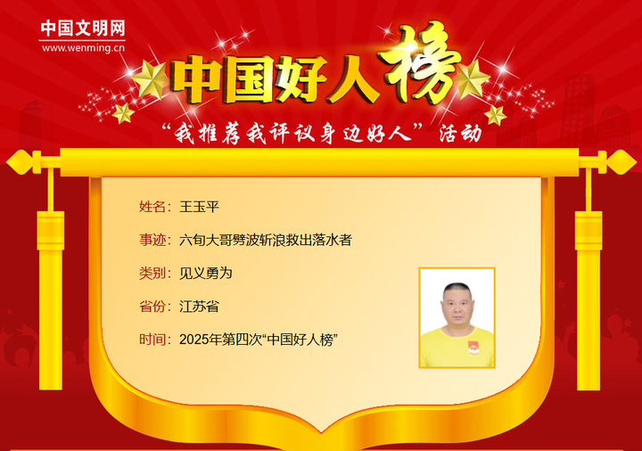 王玉平,男,1966年5月生,江苏连云港港口股份有限公司东方港务分公司职工。2025年10月18日,一位连云港市民不慎落海,命悬一线。在附近冬泳基地游泳的王玉平闻讯立即携救生圈跃入冰冷海中,拼尽全力将落水者拖向岸边,在警民协助下,落水者被成功托举上岸。王玉平因体力透支被离岸流卷走,最终凭顽强意志游回获救。