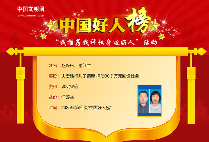 赵兴松,男,1969年11月生,中共党员,江苏省扬州市某公司职工;谢红兰,女,1972年6月生,江苏省高邮市马棚街道高沙园社区居民。爱子赵恺病重时,社会各界伸出援手,筹集善款40多万元。赵恺临终前,将“回报社会”的心愿郑重托付给父母。为践行这句承诺,夫妻二人倾尽所有,将辛苦积攒的30多万元不断捐出。在赵兴松罹患重病后,他们还款报恩的行动也未停止,始终想着要将当年社会捐助的爱心“连本带息”还予社会。