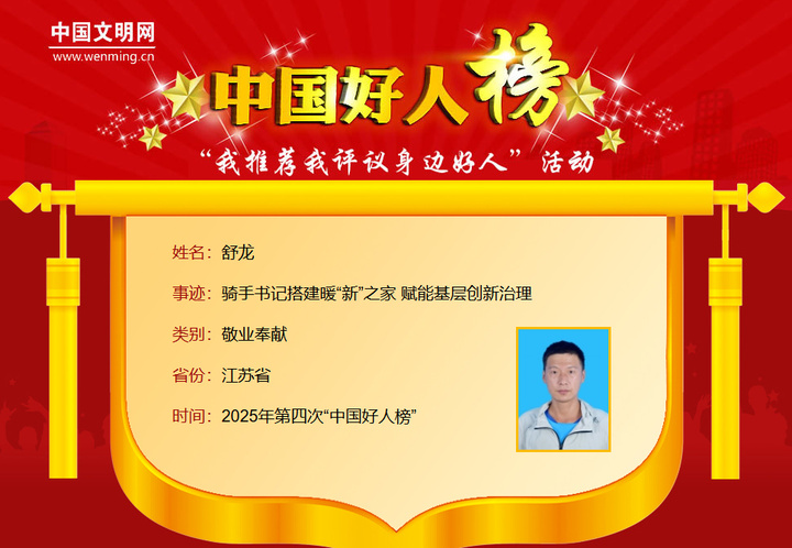 舒龙,男,1985年11月生,中共党员,江苏省苏州高新区东渚街道新就业群体党支部书记、悦“新”驿站站长、某外卖平台外卖员。作为一名外卖骑手,他创下平均配送时长24分钟的优异成绩,100%接单率和零投诉的纪录。作为新就业群体的党支部书记,他成立“舒龙工作室”,搭建起党组织和外卖骑手之间的桥梁,为新就业群体调解劳资纠纷、意外事故等80余起,调解成功率达95%。他成立“新”意满满服务队,吸纳40余名骑手加入团队,带领成员开展安全巡查、服务群众、传递社情民意等活动,为社会基层治理贡献力量。