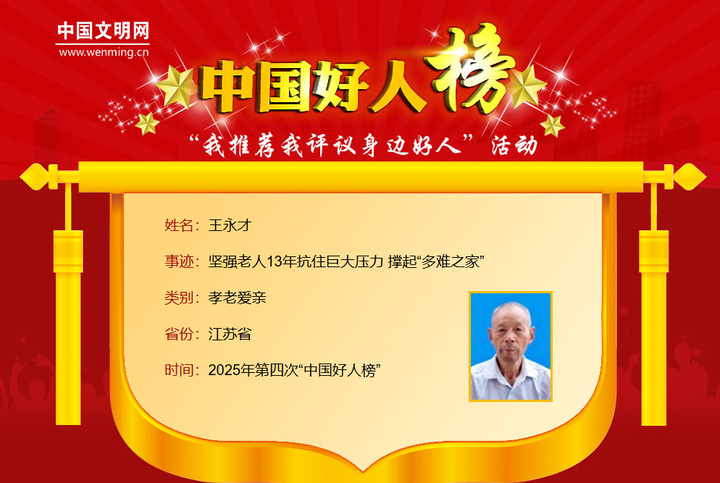 王永才,男,1951年2月生,江苏省扬中市兴隆街道三跃社区居民。13年来,王永才独自扛起儿子重度伤残、妻子双目失明、孙女先天聋哑的三重打击,撑起了这个屡经磨难的家。他每天悉心照料妻子和儿子的起居,喂饭擦身、按摩护理,风雨无阻地推着儿子去医院透析;为了让孙女接受教育,他每周花八个小时送她去镇江特教中心,八年近400个来回,牵着孙女的手追寻希望。王永才用平凡日常诠释责任与担当,以丈夫的忠诚、父亲的坚韧和爷爷的温情,默默守护着家人,传递着亲情的伟大力量。