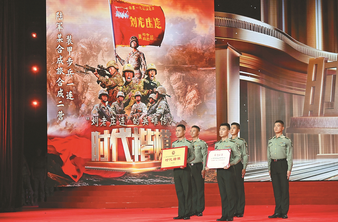 九月二十九日,在“时代楷模”发布仪式上,陆军某合成旅合成二营装甲步兵一连(“刘老庄连”)官兵代表领取“时代楷模”奖牌和证书。(新华社发)
