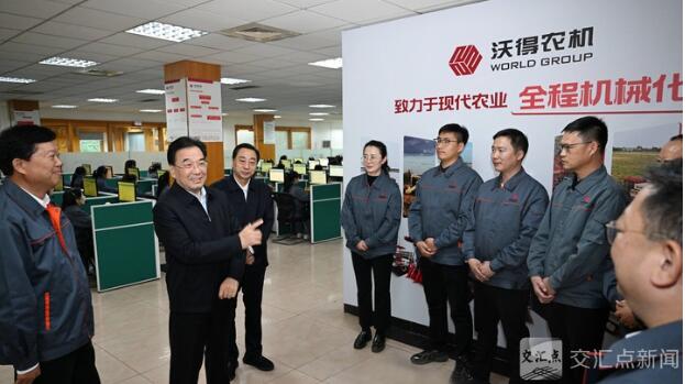 在沃得农业机械公司,各式农机装备依次排列。信长星通过信息化平台了解农机运行情况,观摩无人驾驶农机演示,对企业积极融入共建“一带一路”、拓展海外市场给予肯定。他指出,农业现代化,关键是农业科技现代化。中央《建议》对推进高端智能、丘陵山区适用农机装备研发应用专门作出部署,未来农业机械产业市场空间广阔。希望企业依托我省科教资源和产业配套优势,坚持智能化、绿色化、融合化方向,大力推进产学研融通创新,推出更多新技术新装备,为提升农业综合生产能力和质量效益、加快建设农业强国作出更大贡献。